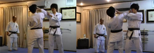 Sin embargo, esto no significa que Motobu Udundī no utilice ninguna técnica de recepción. Existen técnicas como agarrar las manos o, de improviso, golpear los golpes del oponente. También usamos «tsuki-uke (golpe-recepción)» como se muestra a continuación (foto de la izquierda).